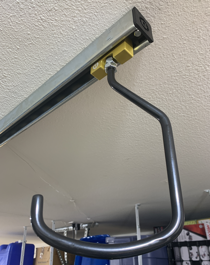 The hooks are made from plastic, roller bearings and regular bike storage hooks. Currently GearBlocks has three sizes available, Standard, Large and Fat Tire. The hooks are delivered with the hook parallel to the sliding channel. In some situations the user may want the hook to be perpendicular to the sliding channel, in which case the user may notify GearBlocks when placing the order. The hooks are meant to be permanently set in one orientation or the other and are set in place when ordered.