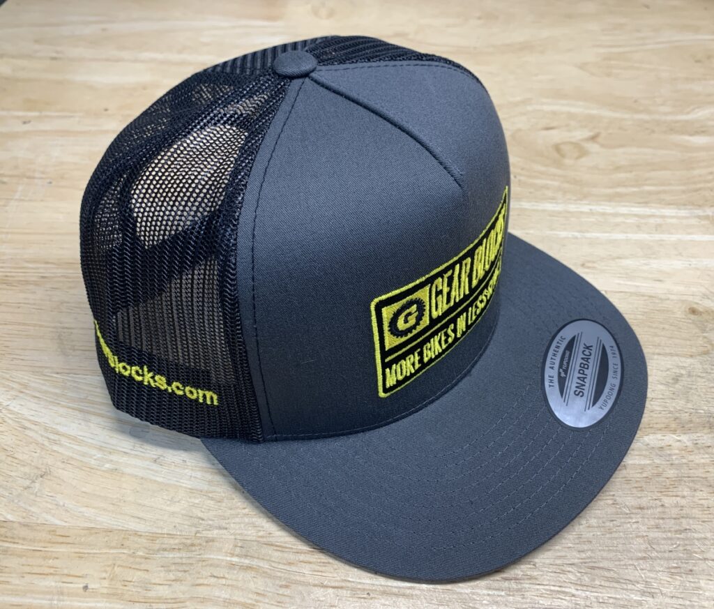 Built on a premium YUPOONG base, this hat features a clean gray front, breathable black mesh, and bold black-and-yellow GearBlocks embroidery. With “GearBlocks.com” stitched on the side and an adjustable snapback fit, it’s made to stand out wherever you take it—trackside, trailside, or just kicking back.