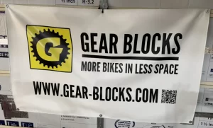 The design features the GearBlocks logo front and center, paired with a convenient QR code that makes it easy for customers to instantly learn more or shop online. The tagline “More Bikes in Less Space” reinforces the core value of the GearBlocks system, making it clear what your display stands for at a glance.