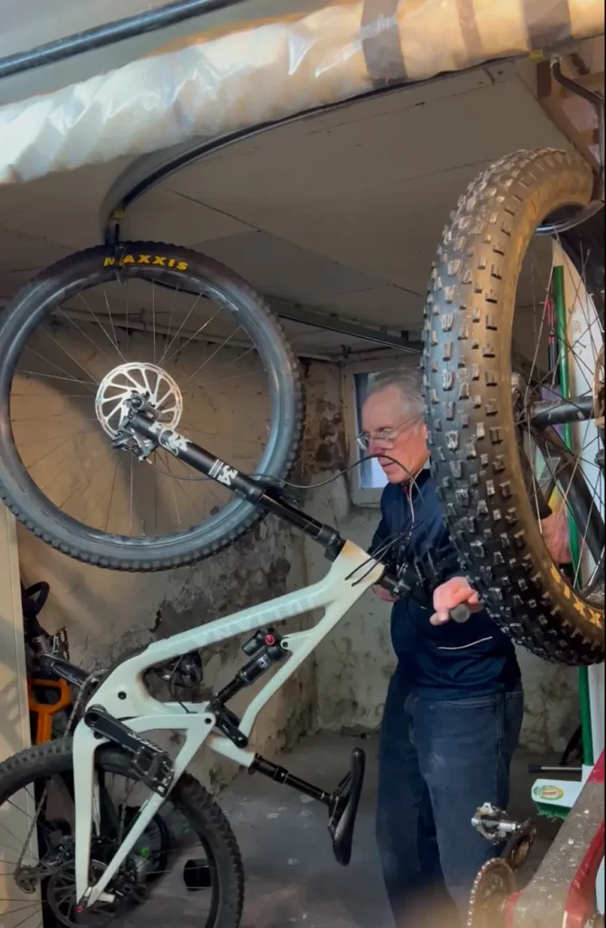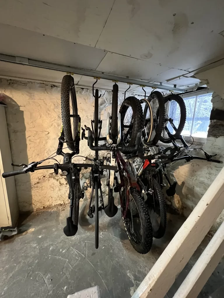 Bikes stored on straight and curved strut with modified GearBlocks Hooks