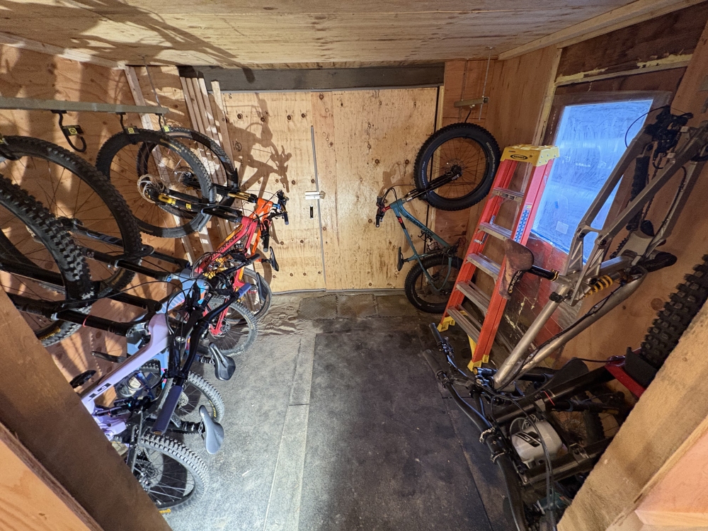 This application is in a small outdoor shed. A single 10ft strut is being used to store several mountain bikes. The system saves space and allows access to other items in the shed.